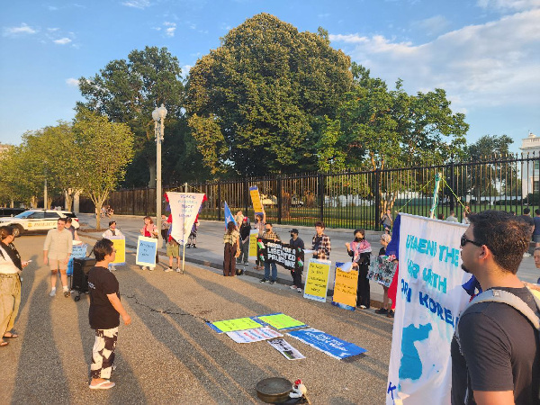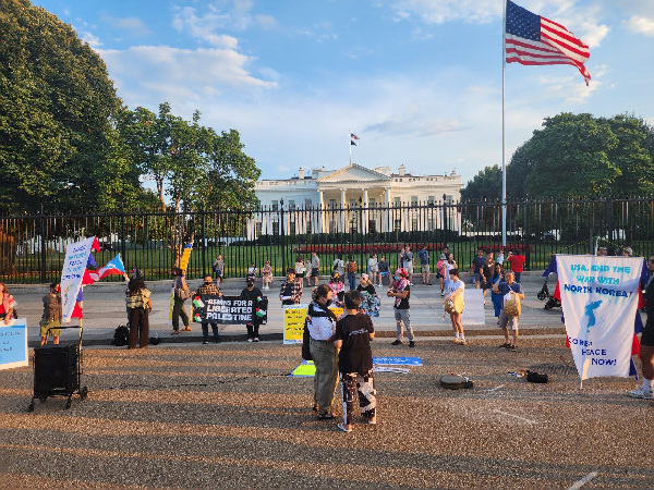 미국 백악관 앞에서 한반도 평화협정 체결을 요구하는 목소리가 우렁차게 울려퍼졌다. 광복절인 15일 오후 7시(현지시간) 백악관 앞에서 한인 동포와 현지 평화단체 활동가 수십 명이 모여 한반도 평화 정착을 촉구하는 집회를 열었다.