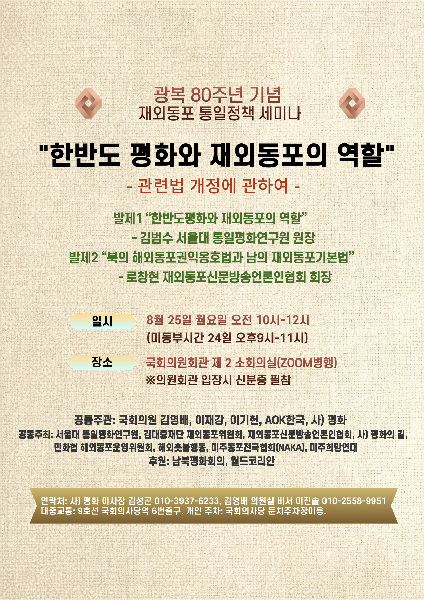 광복 80주년을 맞아 국회에서 사상 처음 남북한 재외동포법 비교와 통일정책을 다루는 세미나가 열리게 돼 관심이 모아진다.