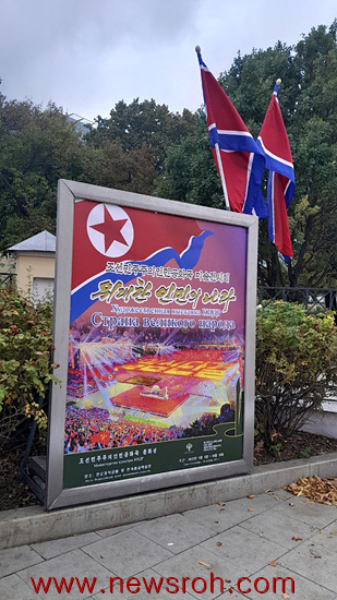 박물관 정문 양쪽에 북한과 러시아국기가 걸린 전시회 포스터가 각각 걸려 있었다.