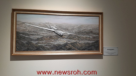중앙 전시 공간의 마지막 부분은 해방후의 북한모습 그리고 한국전쟁 관련한 작품들(미국의 만행과 초기 북한군의 승리모습) 참전 북한의 노군인이 손녀와 함께 있는 그림이 인상 깊었음.