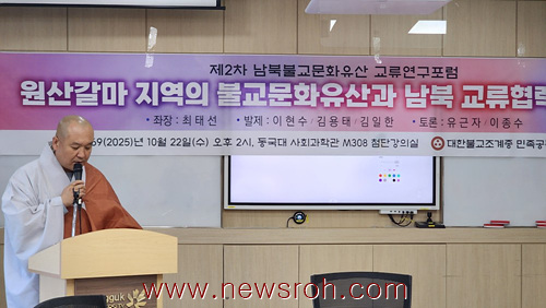 조계종 민족공동체추진본부(본부장 성행스님)가 22일 제2차 남북불교문화유산 교류연구포럼을 동국대 사회과학관에서 개최했다. 이번 포럼은 ‘원산갈마지역의 불교문화유산과 남북교류협력가능성’을 주제로 최태선 중앙승가대 교수(남북불교문화유산 교류연구위원장)이 좌장(座長)을 맡아 진행했다.
