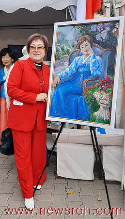 아샤 유가이 (러시아고려인연합회 고문)-미하일 장이 그린 자신의 모습과 함께 포즈를 취했다.